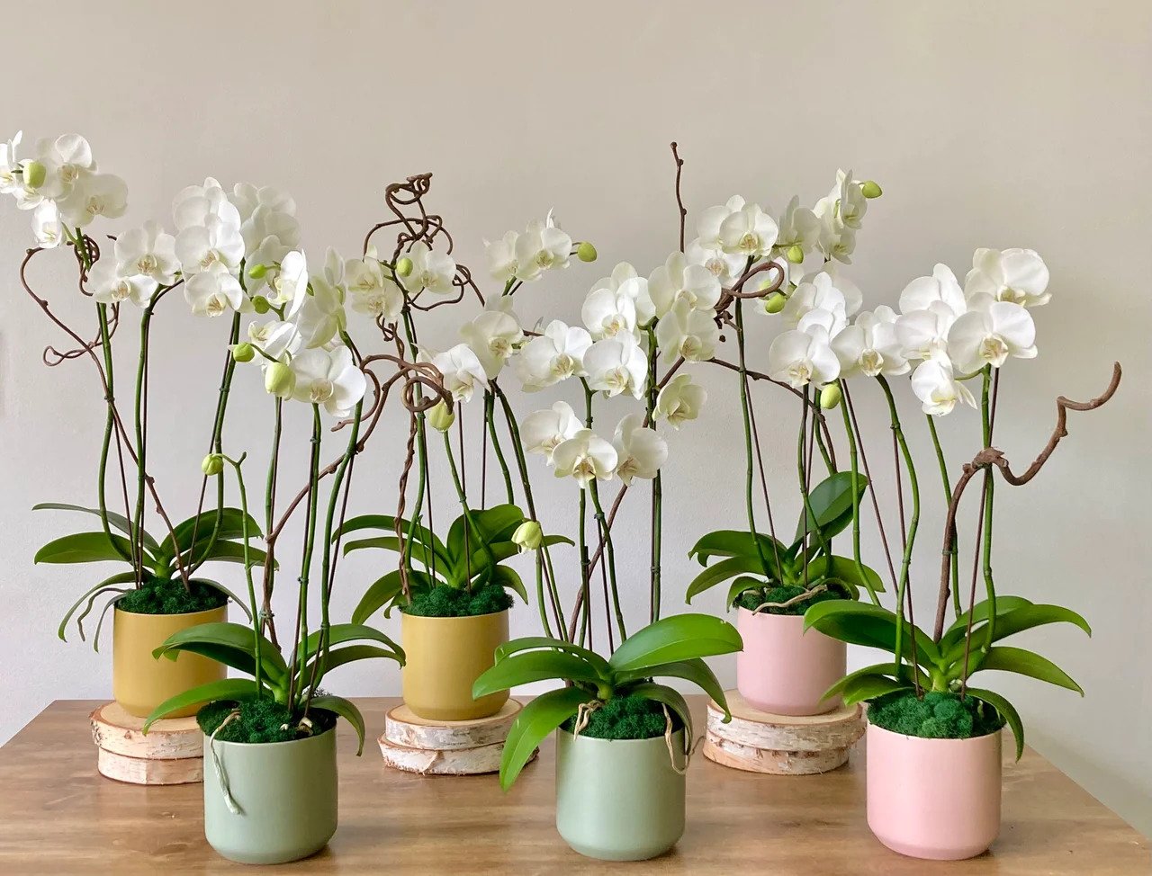 A phalaenopsis orchid plant, grown by a local greenhouse, finished with kiwi branches and moss is an elegant and classic gift. The $75 and $100 options are each single plants. Most of the larger orchids are 2 spike plants, and all will have blooms as well as buds. A care sheet is provided with each plant.